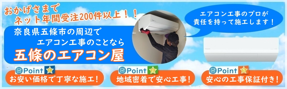 五條のエアコン屋は家庭用のエアコン工事を主にエアコン取り付け・取り外し工事をおこなっている地域密着のエアコン業者で、五條市を中心に奈良県で活動しております。