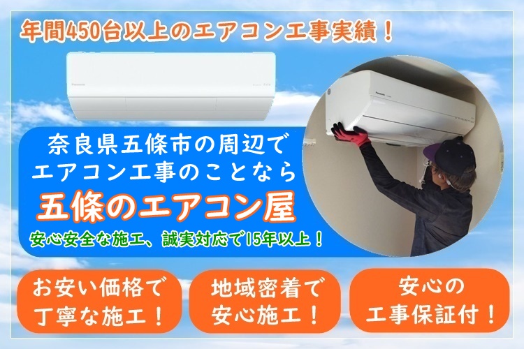 「五條市 エアコン取り付け」や「奈良県 エアコン工事」とネット検索すると複数の工事業者が表示されるかと思いますので、価格だけではなく当社のような実績のあるエアコン工事業者や地域密着の空調会社に依頼する事をオススメします。